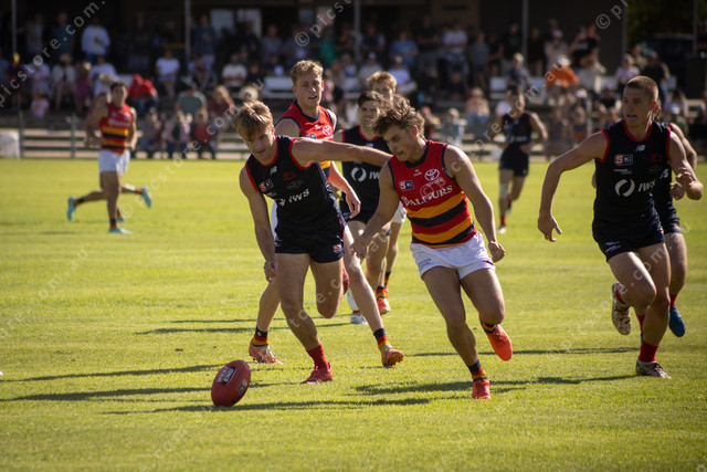 Norwood captain Jacob Kennerley and Adelaide player Ned Atkinson race to the ball. (Mitchell Paterson: 476426_12)