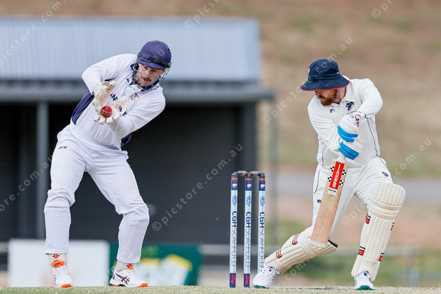 Angaston wicketkeeper Riley Leggett takes behind the stumps after a ball spun right past the outside edge of John Ritzema’s bat. (516250_07)