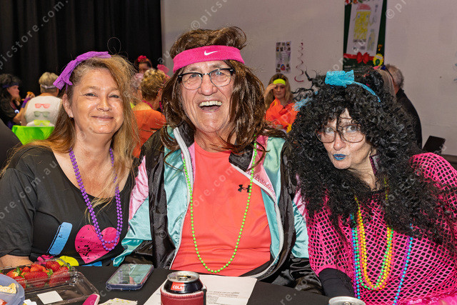 Cathy Treloar, Colin Wardrop and Jill ‘Tilly’ Jones at the Gawler RSL’s 80s Musical Bingo event at the Gawler Civic Centre on Friday night. (Mark Willoughby: 518225_01)