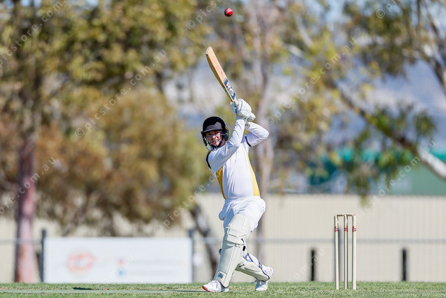 Angle Vale’s Joshua Pfeiffer crunches one over mid-on. (517967_02)