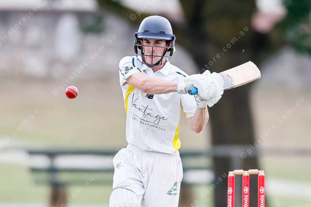Sandy Creek’s Will O’Brien opts for a flat-back smack past the bowler. (519744_04)