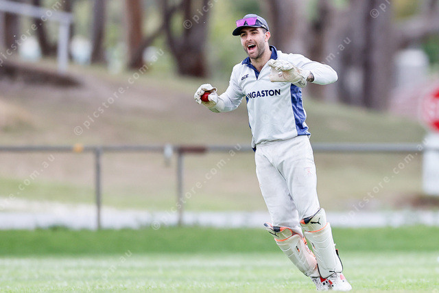 Angaston wicketkeeper Dylan Schmidt celebrates after holding onto a catch. (519744_05)