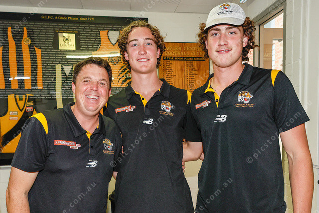 Gawler Central Football Club president Simon Argent with star juniors Hugo and Callan Semmler at Wednesday night’s AFL Draft watch party. (Mark Willoughby: 519566_01)