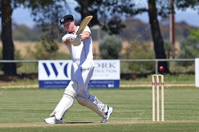 Mallala’s Jake Birchmore takes a big swing and inside-edges one down the leg-side. (514797_01)