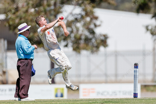 South Gawler’s Tyson Golder flies through the air into his delivery past umpire Rick Drewer. (Mark Willoughby: 514850_04)