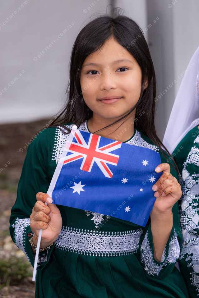 Atina from Payam Dari School about to perform on stage holding an Australian Flag.