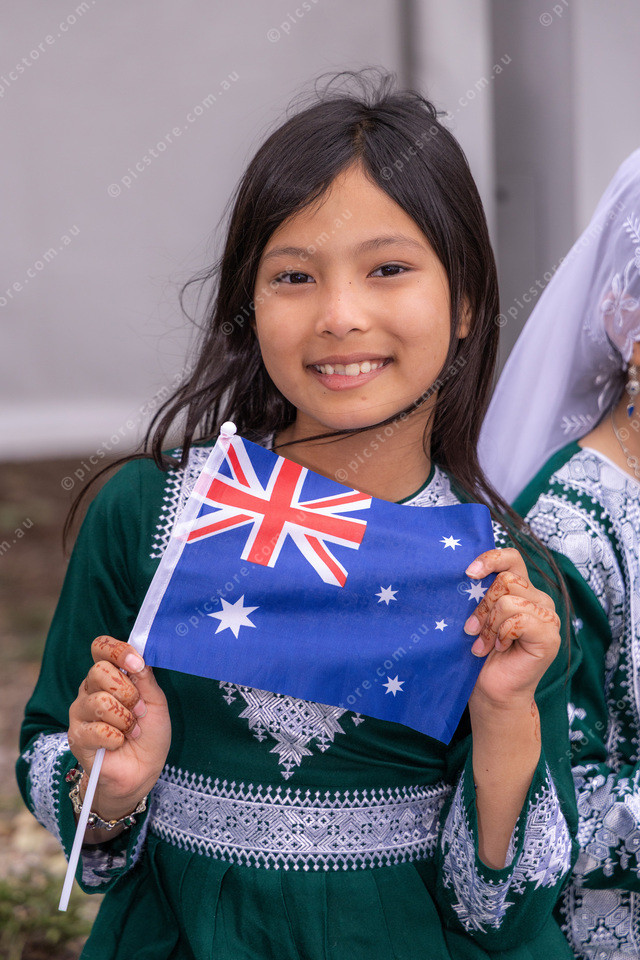 Atina from Payam Dari School about to perform on stage holding an Australian Flag.