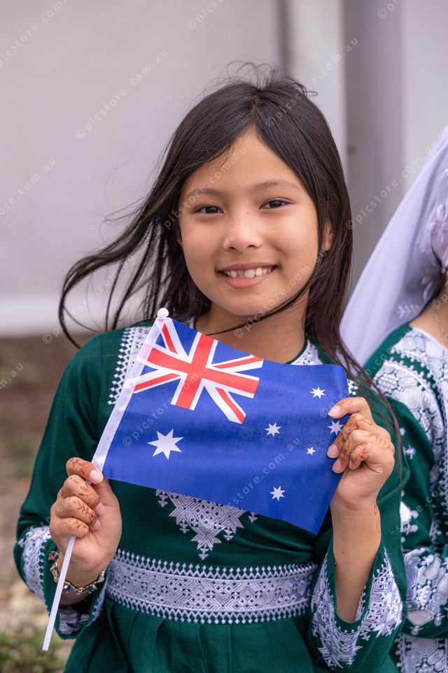 Atina from Payam Dari School about to perform on stage holding an Australian Flag.