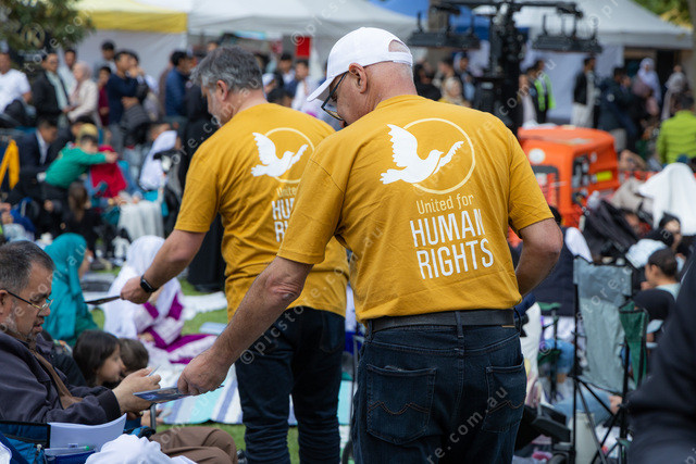 United for Human Rights moving amongst the crowd handing out leaflets.