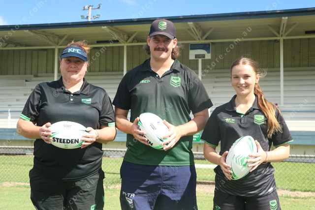 (l-r) The NRL’s Alicia Hall, Lachlan Delbridge and Larney Steggall held the League Stars junior footy clinic at Murgon. (Julian Lehnert: 472269_05)