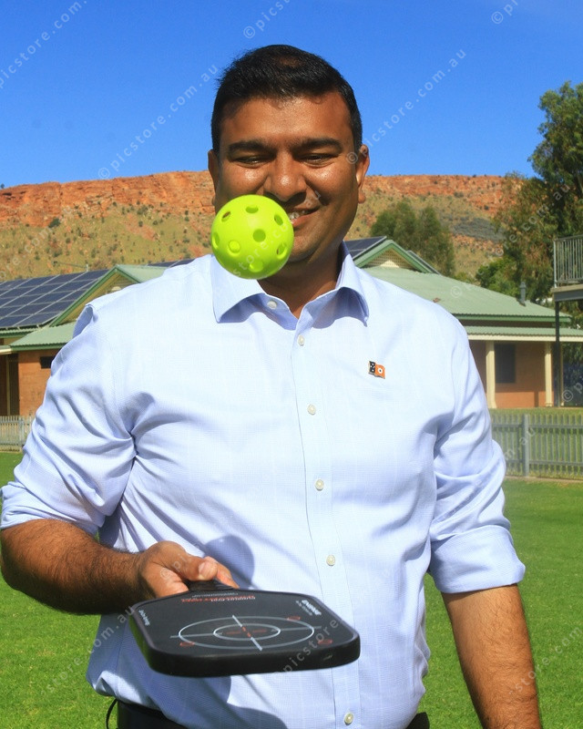 SPORT: NT Sports Minister Jinson Charls getting some hands on experience with pickleball in Alice Springs (PIC: PHIL WILLIAMS 487161_02)