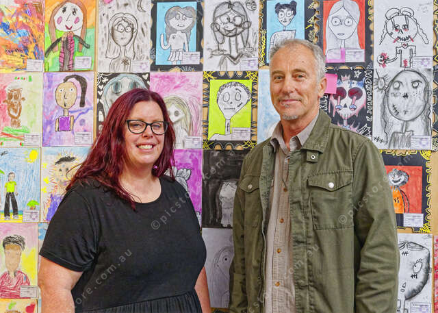 Cat Miller (Visual Arts teacher) and Brett Squire in front of student self-portraits (Ivan Kemp) 517038_06