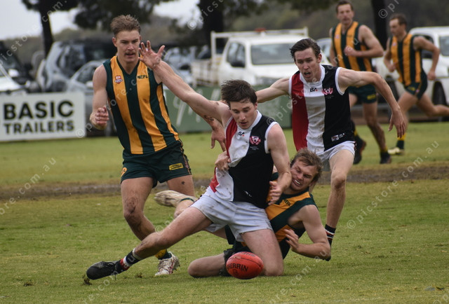 Adelaide Plains’ Joshua Studham goes to ground thanks to a tackle from Zac Green. (Jarrad Delaney: 483102)