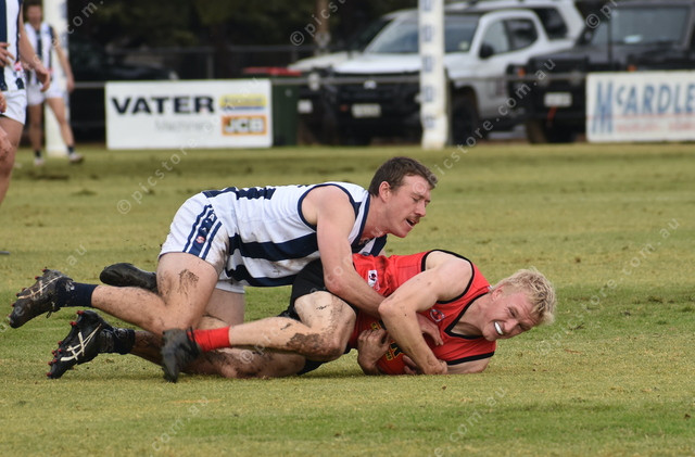 Yorke Peninsula’s Isaiah Wilksch on the ground after being tackled by Campbell Combe. (483102)
