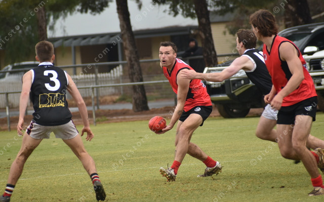 Yorke Peninsula’s Sam Taylor attempts to handball to teammate Connor Knight. (483102)