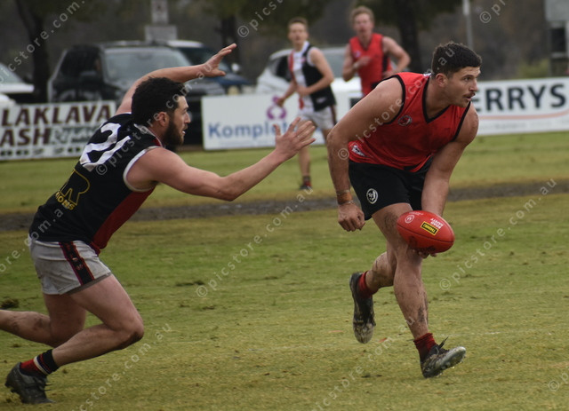 Otis Carthy goes for a handball as Adelaide Plains’ Patrick Binyon dives for the tackle. (483102)