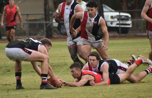 Adelaide Plains’ Brandon Taylor takes the ball away from Jake Hodby, following the tackle fromm teammate Jacob Battle. (483102)
