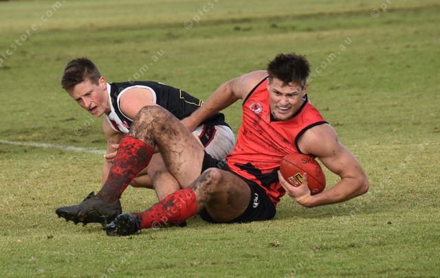 Yorke Peninsula’s Phoenix Foster wins the ball against Jamie Humphrys. (483102)