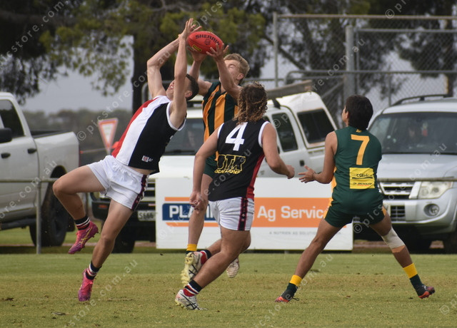 Adelaide Plains’ Michael Daly and North Eastern’s Charlie Weckert contest the mark. (483100)