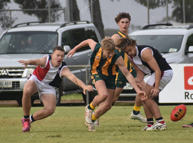 North Eastern’s Charlie Weckert pursues the ball against Adelaide Plains’ Michael Daly and Dylan Martin. (483100)