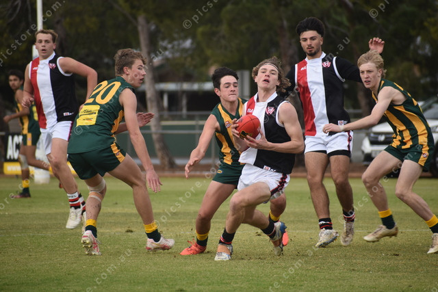 Adelaide Plains’ Hamish Wildbore changes direction to try and kick the ball into the 50 under pressure. (483100)
