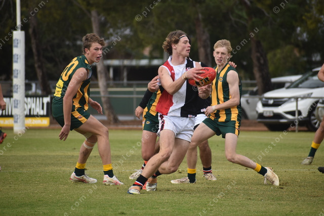 Adelaide Plains’ Hamish Wildbore changes direction to try and kick the ball into the 50 under pressure. (483100)