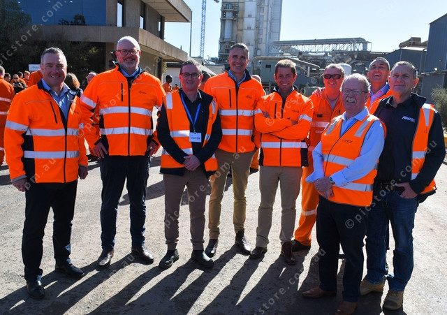 MP for Stuart Geoff Brock, Minister Tom Koutsantonis and Australian Workers Union SA Branch Secretary Gary Henderson on site at the Pirie smelter (Neralie Bailey: 494470_04)