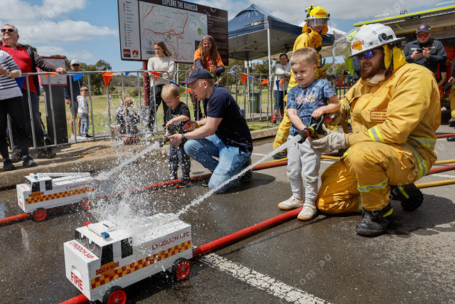Nate, assisted by Ronan Emms and Atticus, assisted by Yuseph Miller race the mini fire-trucks. (509897_42)