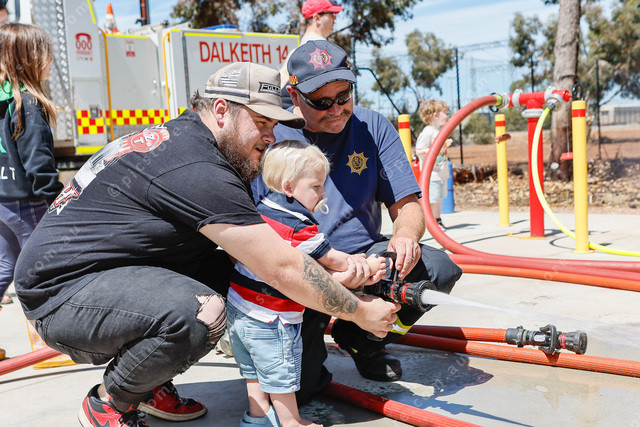Jessie Roberts and Zaylin try the fire hose, with the assistance of Jamie Pugh. (511362_15)