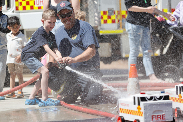Vander and Jamie Pugh race a mini firetruck using the fire hose. (511362_18)