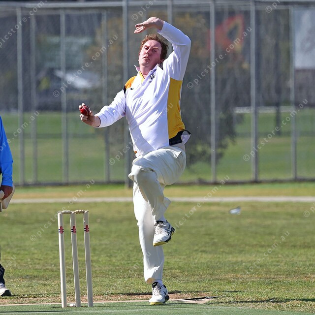 Justin Carman bowling some early overs for Angle Vale. (511602_02)