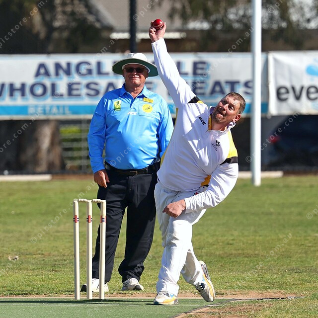 Bradley Banks revs up some off-spinners for Angle Vale. (511602_06)