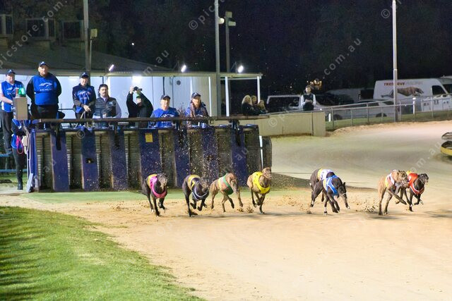 The Gawler Gold Cup finalists spring out of the boxes to begin the 531m sprint. (513132_02)