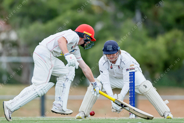 Corey McDean corrals a half-volley behind the stumps as Southern Districts’ Steven Harman makes his ground. (512996_07)