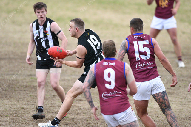 Aaron Crichton (19 Belgrave) with the ball, right is Sam Cachia (15 Pakenham). 489626_09