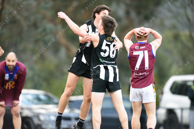 Final Siren, Belgrave win.Charlie D Morrison (27 Belgrave) jumps on Nicholas Mackay (56 Belgrave), right is Jake Wright (71 Pakenham). 489626_65