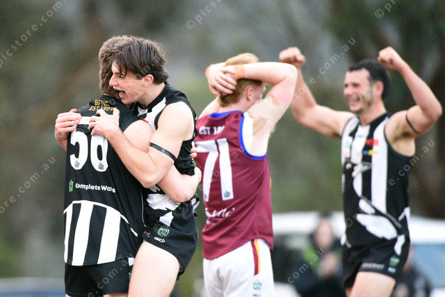 Final Siren, Belgrave win.Charlie D Morrison (27 Belgrave) jumps on Nicholas Mackay (56 Belgrave), right is Jake Wright (71 Pakenham). 489626_69