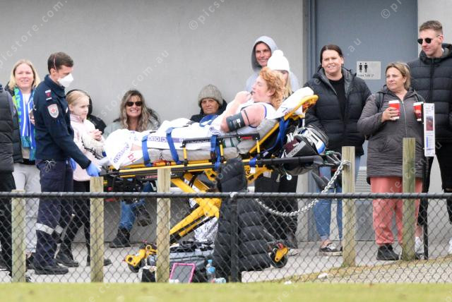 Support from the Crowd. An injured Berwick Springs player is taken into an Ambulance. 293983_01