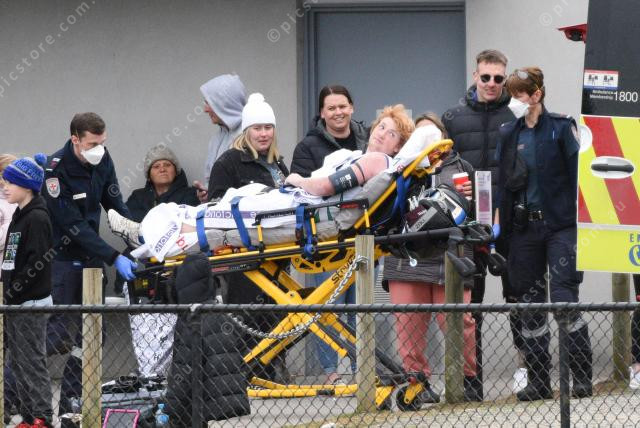 Support from the Crowd. An injured Berwick Springs player is taken into an Ambulance. 293983_02