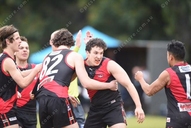 Emerald #8 (second from right) kicks a last Q goal. 293983_10