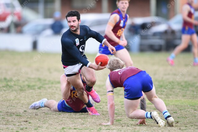 Joshua Haggar (27 Pakenham) grabs Bayley Sciortino (6 Seville). Right is Lachlan Rice (61 Pakenham). 484176_10
