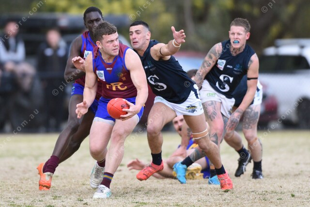 Rhys Brooks (25 Pakenham) with the ball. Reaching for him is Dean Eliades (33 Seville). 497913_15