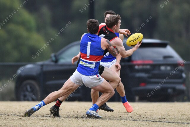 Macauley Beckwith (1 Wandin) tackles Ewan Wadsworth (4 Emerald). 489625_16
