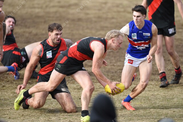 Harvey Siwes (5 Wandin) with the ball. Teammate behind is Luke Spaulding (3 Wandin). 489625_33