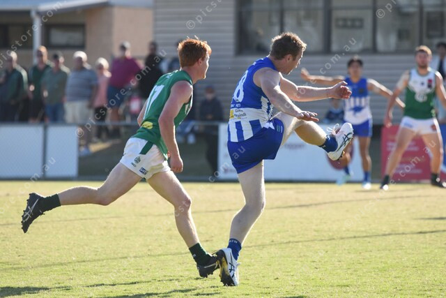 Frankie Trott (17 Gembrook Cockatoo) chases Brent Moloney (18 Officer). Brent tries for a goal but misses. 476845_33