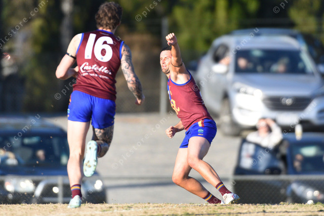 Tanner Stanton (3 Pakenham) kicks a goal in the final quarter. Teammate Benjamin Green (16). 495024_38