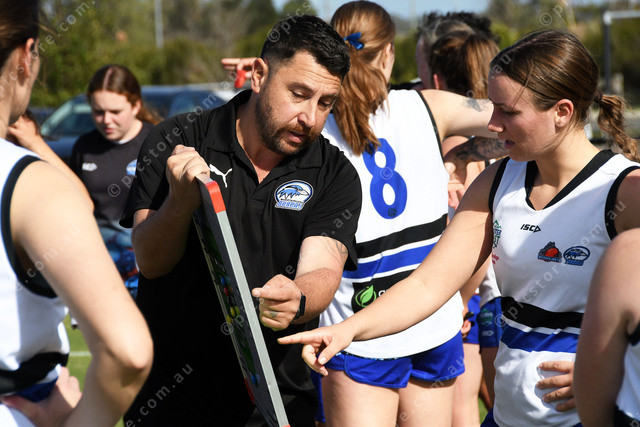 Warburton-Wesburn Snr Women coach Ashley Taylor and Sally McIntosh (vice captain) talk tactics with the magnet board 469871_30