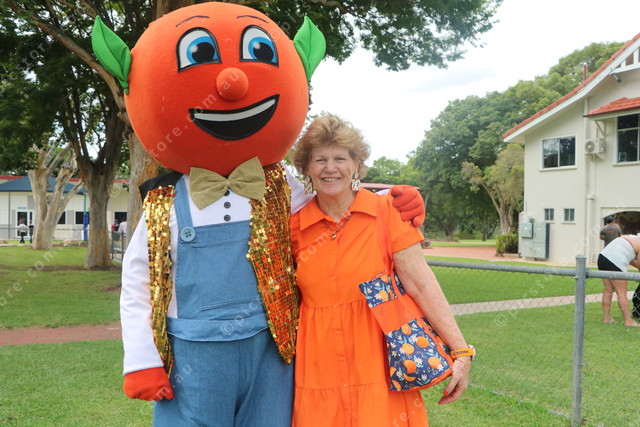Gayndah Orange Festival mascot Gay Dan and committee president Dael Giddins. (Julian Lehnert: 476323_01)