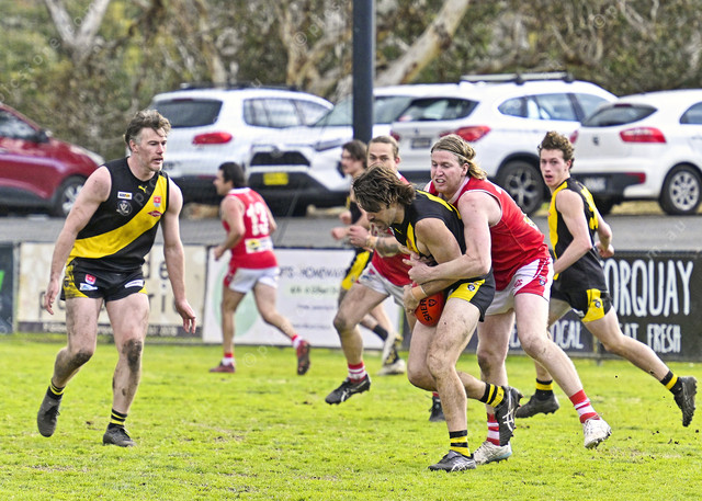 Ben McNamara is caught in a tackle by Jai Hale (Ivan Kemp) 494915_33