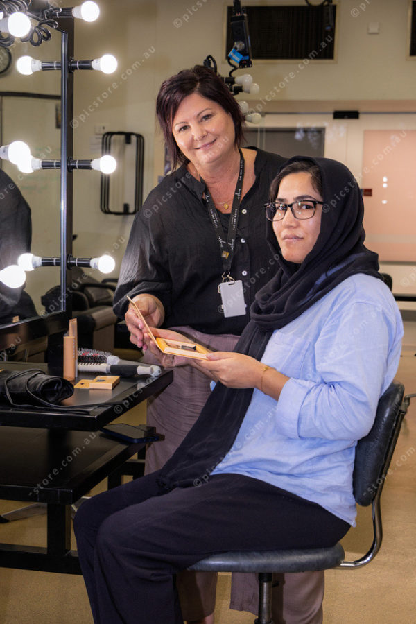 (Standing) Vanessa Drummond (Education Manager Hair and Beauty) and (Sitting) Marzia Rezaie from Dandenong South attending the Hair and Beauty open day.